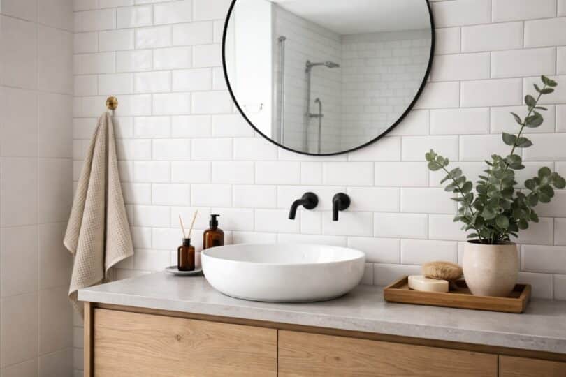 Omlott kakel bryter upp väggen. Raka lodräta foglinjer kan kännas lite stela, medan omlott ger ett mjukare uttryck. Det funkar extra bra på klassiska “subway tiles”, men också på större rektangulära plattor i dusch, bakom tvättställ eller som stänkskydd i kök.