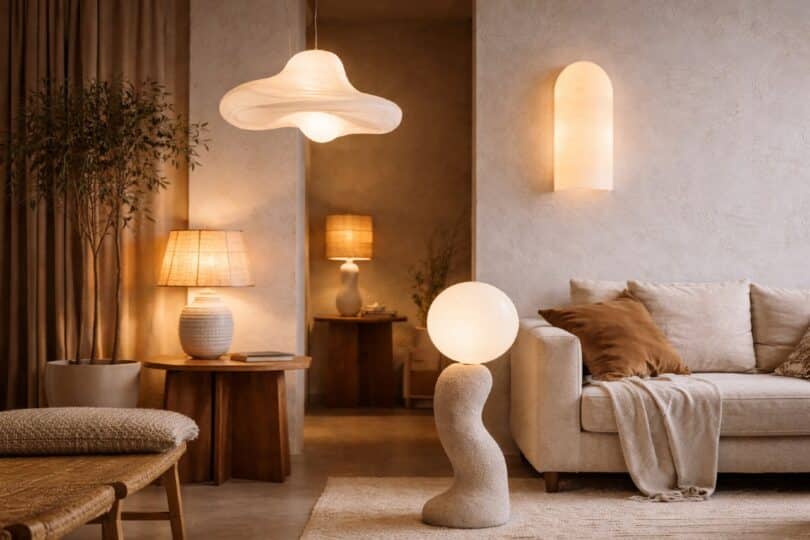 Lampor med mjuka, organiska former dominerar. De fungerar lika mycket som inredningsdetaljer som faktiska ljuskällor och bidrar till helhetskänslan i rummet.